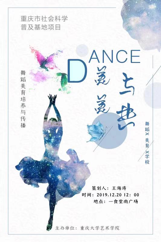 ​2019年12月20日中午,森林舞会 王海涛副教授作为此次活动的负责人,带领舞蹈学研究生团队,在重庆大学虎溪校区一食堂南广场举办了“重庆市社会科学普及基地“2019年科普系列活动之一《美美与共——舞蹈美育培养与传播》科普活动。本次活动主题鲜明,形式多样,趣味十足,引来大批学生驻足,并积极参与活动。现场气氛活跃,科普活动圆满成功。活动开始前,舞蹈学研究生们在活动地点布置场地,准备精美的奖品,播放宣传ppt,营造...