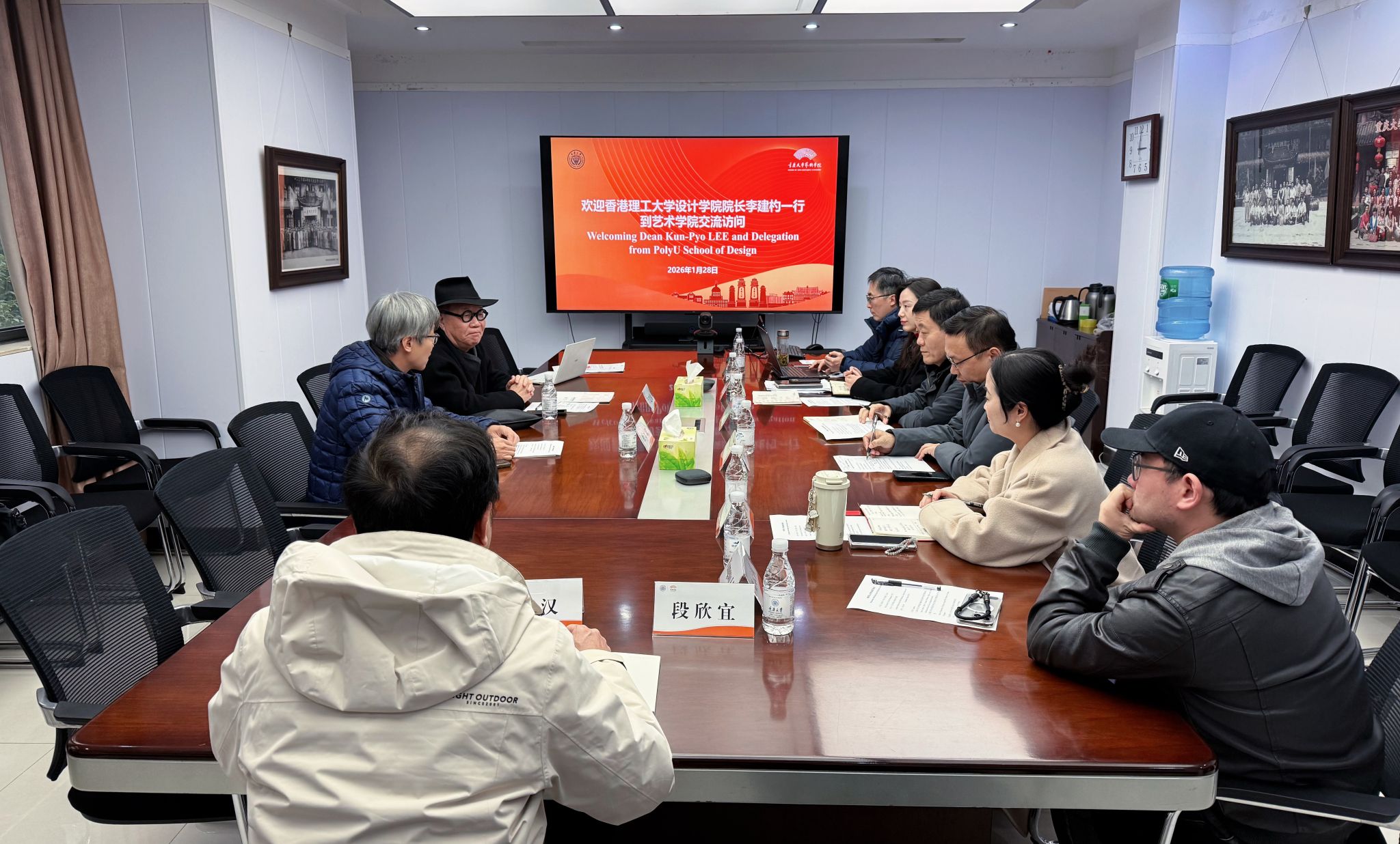 的发展历程、学科布局与人才培养情况。彭科星介绍了设计专业的特色优势与教学成果。李建杓分享了香港理工大学设计学院在创新设计教育、跨学科研究及国际化发展方面的经验。双方围绕共同关心的议题进行了深入探讨,一致认为两院在联合开展学生培养、推动教师科研合作、共建高水平国际化学术平台等领域合作前景广阔,潜力巨大。