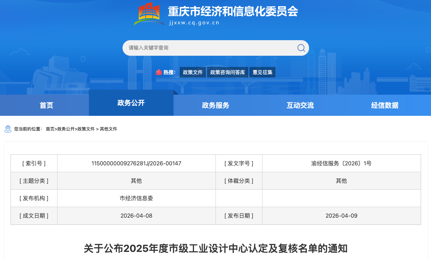 4月9日,重庆市经济和信息化委员会正式发布《关于公布2025年度市级工业设计中心认定及复核名单的通知》。根据通知,经过企业自主申报、区县经信部门推荐、专家评审、现场审查、委党组会审议和网上公示等程序,重庆大学成功入选“2025年度市级工业设计中心名单”,且以“优秀”成绩获评。